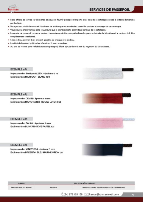 Nous offrons de service sur demande et pouvons fournir passepoil n’importe quel tissu de ce catalogue coupé à la taille demandée