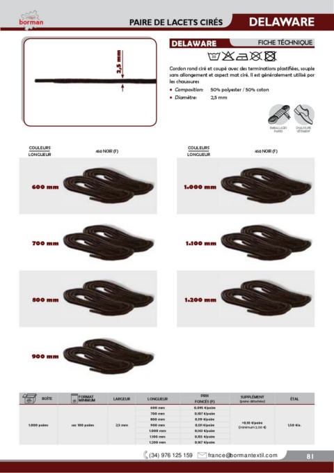 1.000 paires sac 100 paires 2,5 mm 900 mm 0,131 €/paire (minimum 2,00 €) 1,50 €/u.