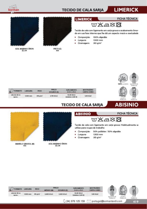Tecido de cala com ligamento em sarja grossa. Habitualmente se