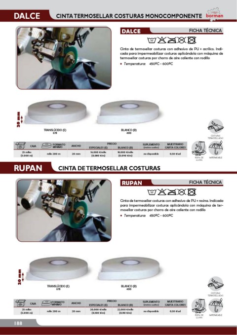 Cinta de termosellar costuras con adhesivo de PU + acrílico. Indi-