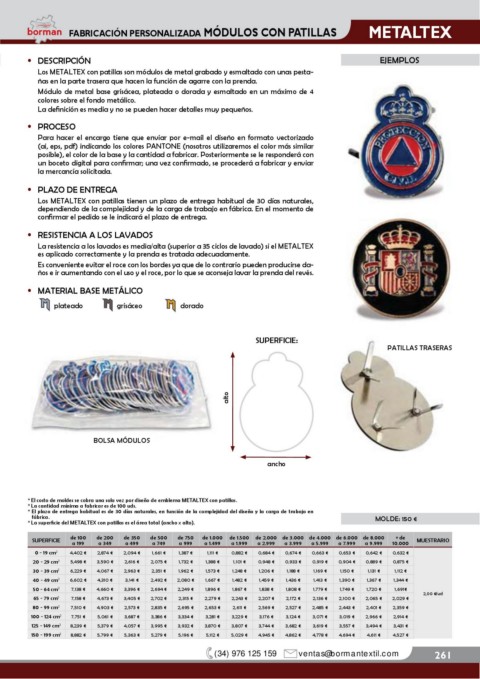 * El costo de moldes se cobra una sola vez por diseño de emblema METALTEX con patillas.