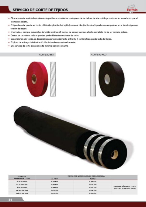 El servicio es siempre para rollos de tejido mínimo 60 metros de largo y siempre el rollo completo ha de ser cortado entero.