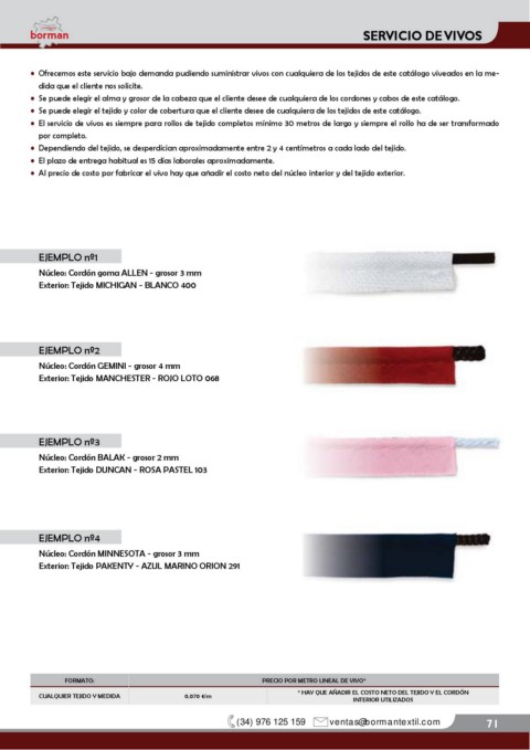 El servicio de vivos es siempre para rollos de tejido completos mínimo 30 metros de largo y siempre el rollo ha de ser transformado