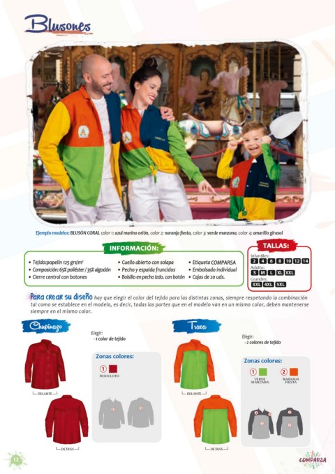 • Tejido:popelín 125 grs/m 2 • Cuello abierto con solapa • Etiqueta COMPARSA 2 4 6 8 10 12 14