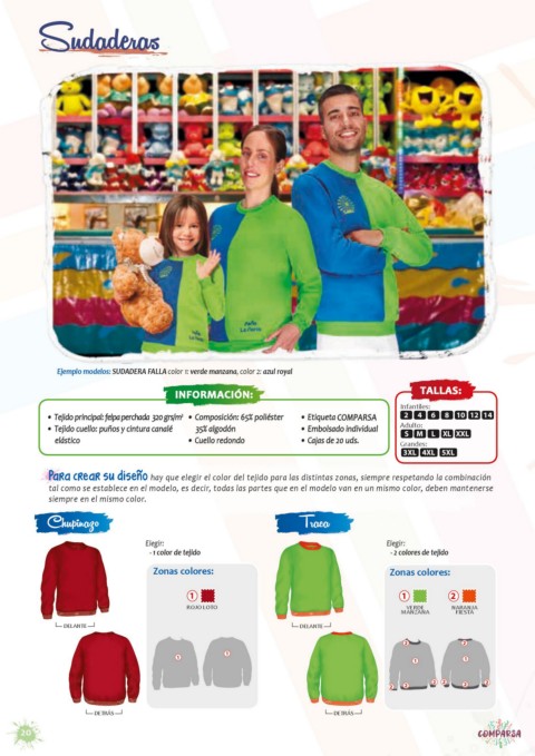 Ejemplo modelos: SUDADERA FALLA color 1: verde manzana, color 2: azul royal